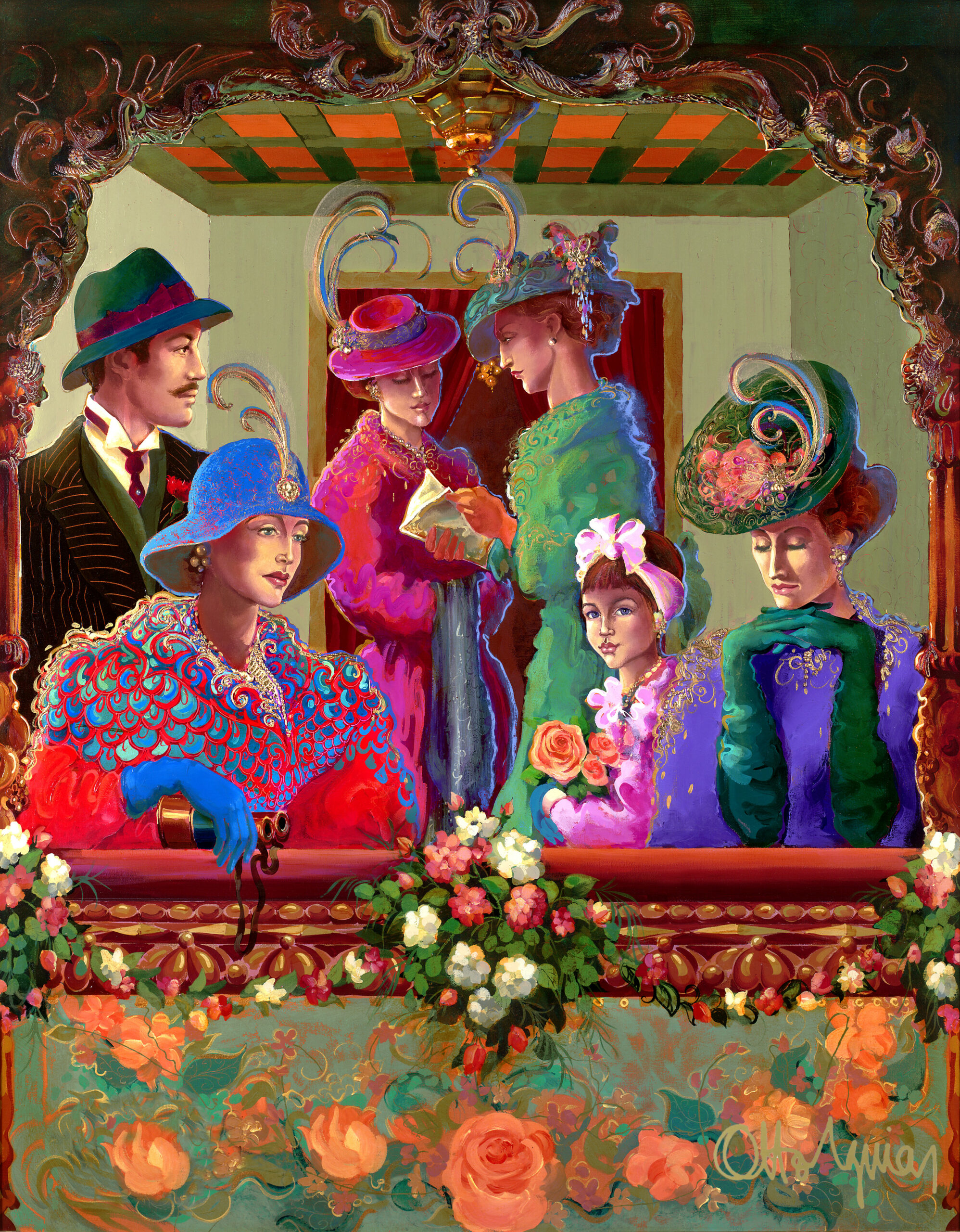 A Theater Box in this legendary, turn of the century landmark, in the Brazilian city of Manaus. The vividly hand-painted balcony and the ceiling are Otto’s interpretation of this charming period of Brazilian history and the economic success in the Belle Epoque. There are four sophisticated female viewers, one gentleman, and Adriana’s adorable child. Intricate embellishment and gold leaf detail render this image a showpiece in any environment.